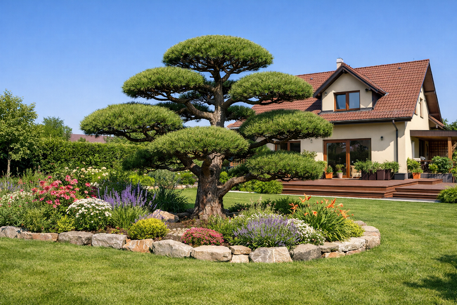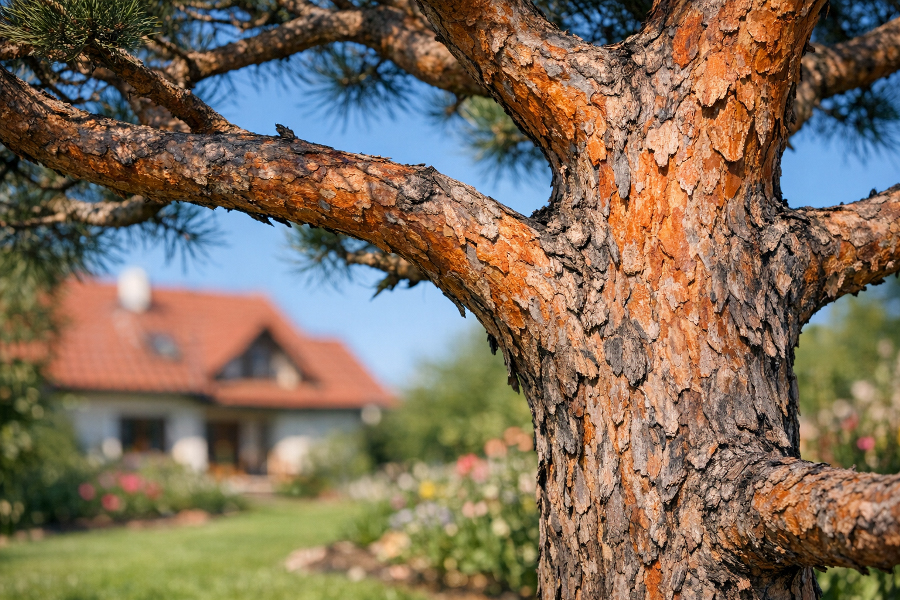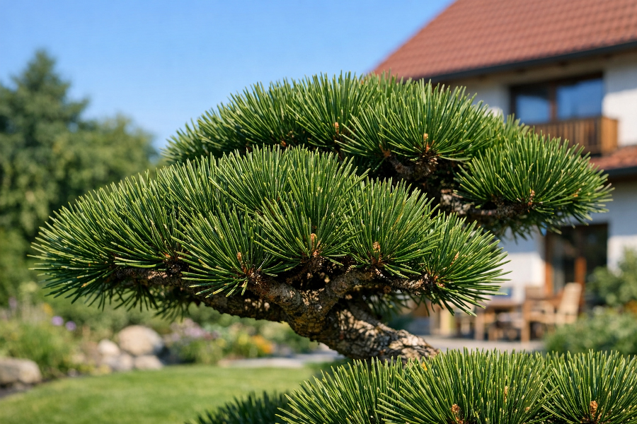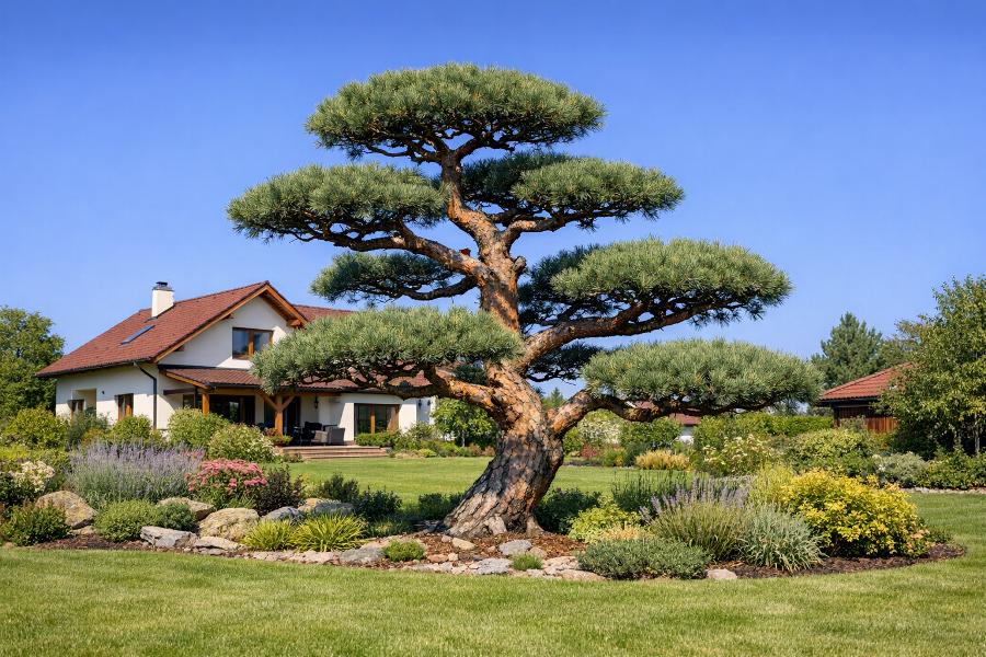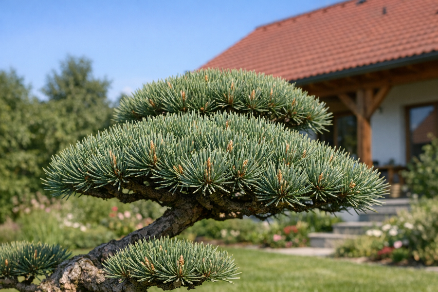 Borovice lesní (Pinus sylvestris) je naopak typická svou lehkostí. Koruna bývá vzdušnější a celkový dojem jemnější, což se výborně hodí do zahrad, kde chcete více „přírody“ než architektury. Velkou roli hraje i kmen: u dobře zapěstované borovice lesní často vynikne krásná linie a typická oranžová kůra ve vyšších partiích. V japonsky laděných zahradách to umí působit až poeticky.